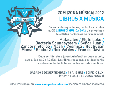 Gracias a los resultados positivos que se lograron en el 2011, regresa la segunda edición de #LibrosXMúsica proyecto que este año busca ayudar a más escuelas . «El año pasado lo hicimos con nuestro disco «Autómata» únicamente, esta vez quisimos invitar a más cólegas del medio para hacer un compilado y se logró» comenta Antonio, promotor de la actividad e intregrante de Cósmica, banda organizadora y coordinadora de la campaña. «La idea principal es intercambiar el cd compilado por libros en buen estado que la gente lleve a los lugares de intercambio abajo descritos».